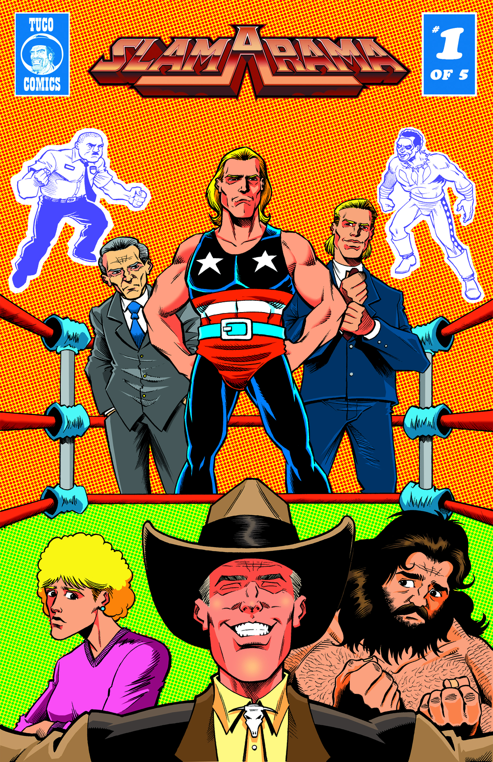 A five-part miniseries about life on the ropes! The year is 1988, and the hottest ticket in America is SLAM-A-RAMA III, the Unlimited Wrestling Federation's latest pay-per-view extravaganza. Follow pro wrestling superstars like Hard Knox, Sasquatch Armstrong, The Beverly Killbillies, Greede S. Goode, and many more, as we examine one night in the lives of the heaviest hitters in the world of sports entertainment. Story and art by Dave Howlett (THE MAKERS, SCENESTER, THE LAST PAPER ROUTE).